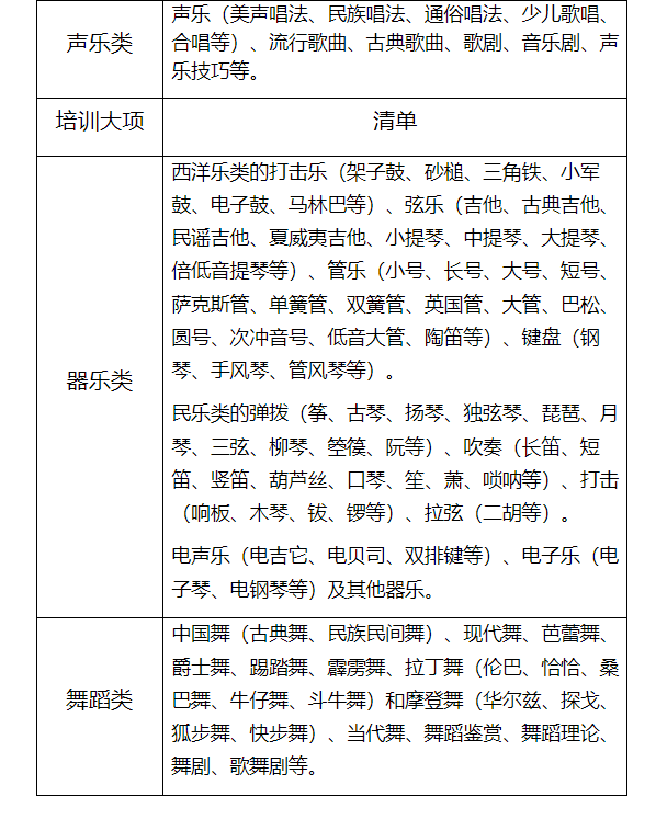 或以上清单内容相关的非学历教育培训,列入文化艺术类进行管理。