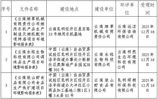根据建设项目环境影响评价审批程序的有关规定,2025年12月16日,我局受理3个建设项目环境影响评价文件,现将受理情况予以公告,公示时间为:自公布之日起5个工作日(不含节假日)。