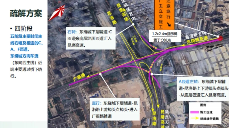 F匝道封闭施工期间需要从昆玉高速呈贡方向进入广福路的车辆,需要从昆玉高速广卫立交桥出口进入广卫立交底层进行左转进入昆洛路,在昆洛路掉头后右转进入广福路。