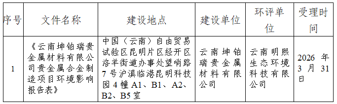昆明市生态环境局关于2026年3月31日建设项目环境影响评价文件受理情况的公示